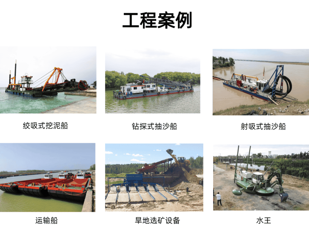 清淤疏浚船舶包括:絞吸式挖泥船、斗輪式挖泥船、射吸式抽沙船、虹吸式抽沙船、鉆探式抽沙船、鏈斗式挖沙船、水陸兩用船、挖機(jī)船、多功能工作船、自吸自卸船、運(yùn)輸船等。