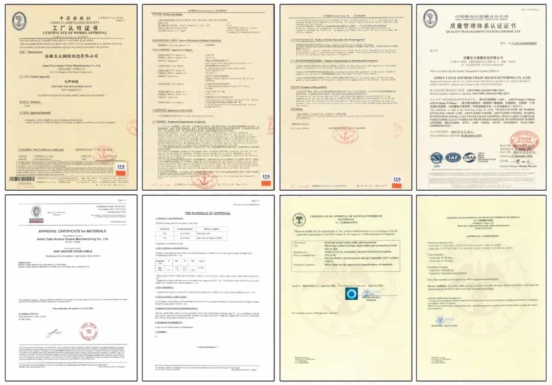亞太錨鏈產(chǎn)品嚴格按照國家標準和船級社焊接規(guī)范要求生產(chǎn),先后通過了GB/T19001-2016/IS09001: 2015質(zhì)量管理體系的認證,獲得中國、俄羅斯、法國、美國、印度、德國、挪威、日本、韓國、德國、意大利等多國船級社的認證,以及地方船檢、漁檢認證。