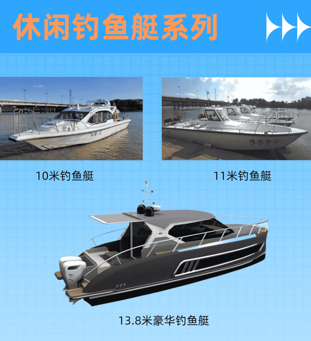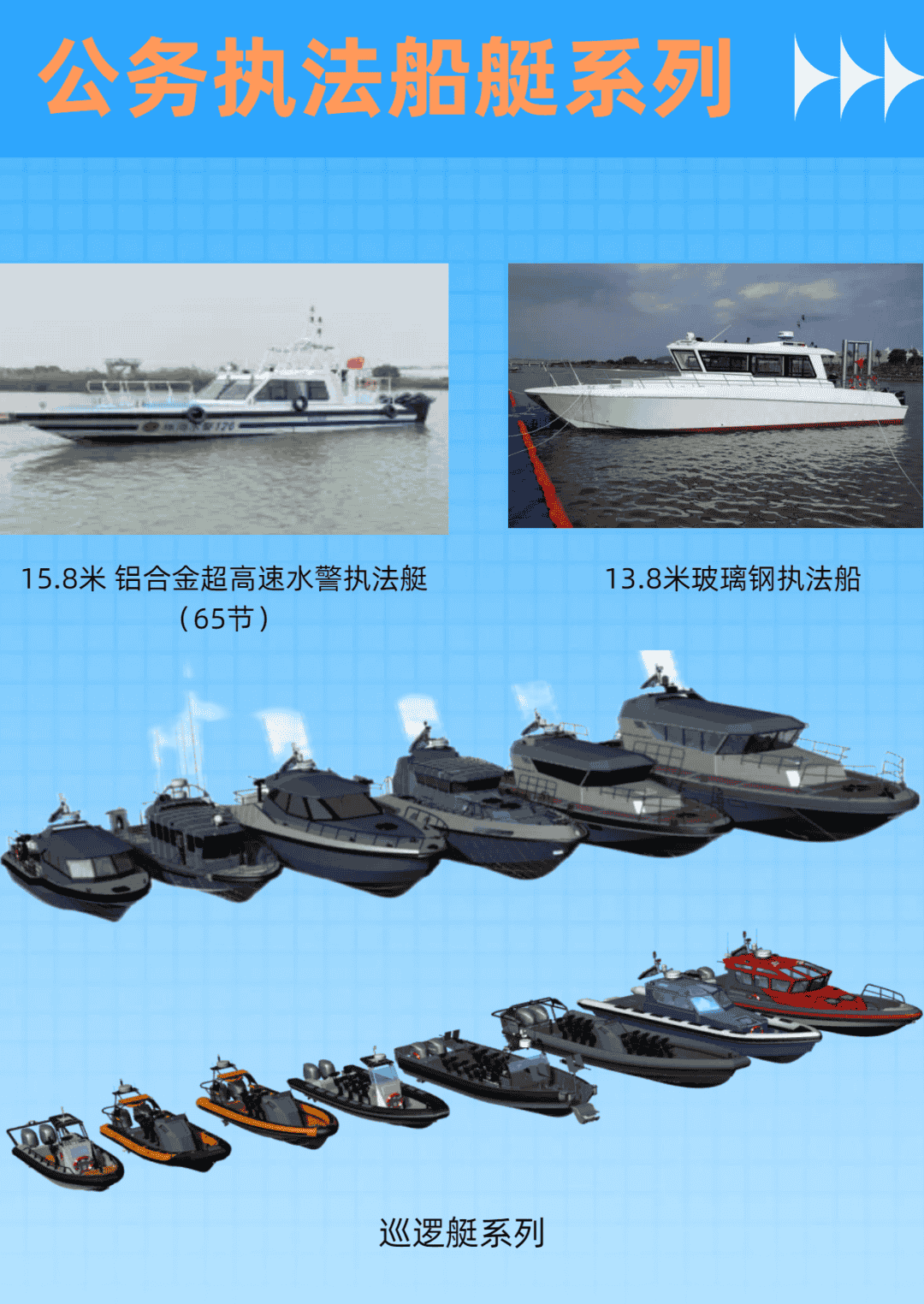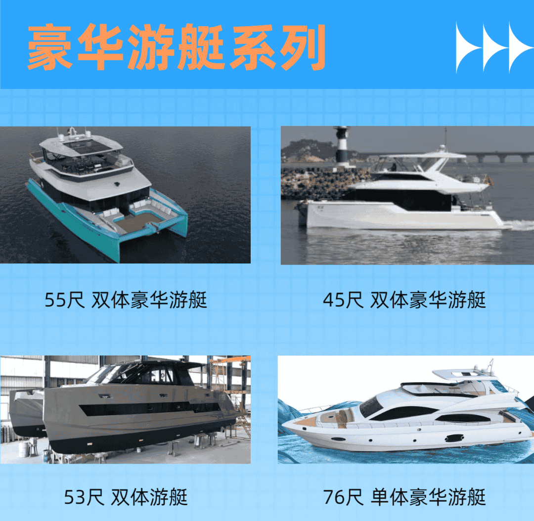 公司的船舶產(chǎn)品線分為六個(gè)板塊:豪華游艇、休閑釣魚艇、旅游船艇、公務(wù)執(zhí)法船艇、特種工作船艇以及新能源船;可使用多種材質(zhì)建造,包括玻璃鋼、鋼質(zhì)、鋁質(zhì)、碳纖維以及鋼鋁、 鋼玻等多材質(zhì)復(fù)合型的船艇。